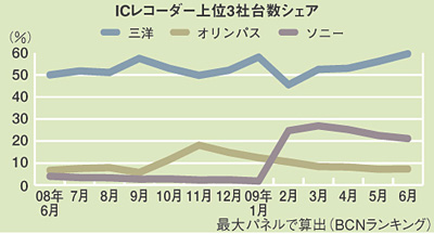 市場をリードするのは三洋電機、ソニー、オリンパスの3社。三洋はトップシェアを維持、直近の6月は59.6%と6割にあと一歩と迫った。三洋を追い上げるのは昨年まではオリンパスであったが、年明け以降、低価格モデルを投入したソニーが躍進。2月以降は20%台まで伸ばし、2位の座を確保している。