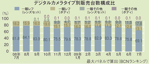 昨年10月末にパナソニックが出したマイクロフォーサーズ規格の「G1」が、発売翌月に瞬間的に9.3%を記録。今年7月にはオリンパスが同規格の「E-P1」を出したことなどで市場が一気に花開き、一眼市場の2割に迫る動きになっている。