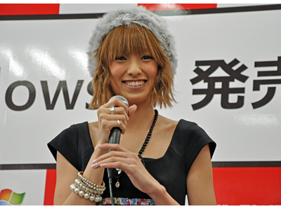 ゲストの南明奈さん 冒頭の挨拶として、ビックカメラの宮嶋宏幸・代表取締役社長がステージに登場。「PC市場はここ数年、売り上げが厳しい。Windows 7の販売を機に大いに盛り上がってくるのでは」と期待を寄せた。また、店頭施策として、「ビックカメラとソフマップでは、『Windows 7エキスパートゴールド』の資格をもつ者など、専門のトレーニングを積んだ専門販売員を養成してきた。お客様一人ひとりに製品のよさを伝え、ニーズに応えたサービスを提供していきたい」と抱負を語った。
