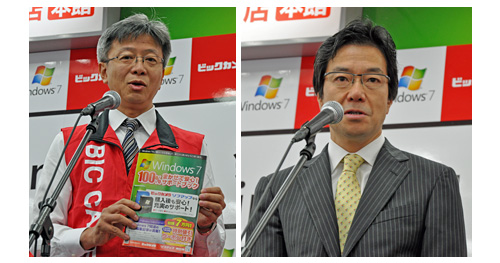 (左)ビックカメラの宮嶋宏幸・代表取締役社長、(右)マイクロソフトの樋口泰行・代表執行役社長 次に、「Windows 7」を提供するマイクロソフトの樋口泰行・代表執行役 社長が現れ、同OSについて「プログラムを書き始める前にユーザーの声を聴き、シナリオを作った」と開発背景を明らかにした。さらに、「マウスやキーボードを使わない『マルチタッチ』は(これまでのPCとは異なる)大きな変換点」だと指摘。「PC自体がユーザーにとって身近な存在になるよう、(パートナー企業と協力して)技術を組み合わせることで、フレンドリーなものにしていきたい」と今後の方向性を示した。