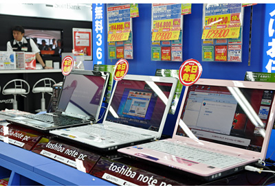 PCフロアにはWindows 7搭載PCが並ぶ(写真は東芝) このほか、PCメーカー7社の代表者らが新OS発売について、祝辞を兼ねたコメントを述べた。東芝の深串方彦・執行役上席常務 PC&ネットワーク社 社長は「09年秋冬モデルはラインアップが豊富。今回、『ネットノート』という新しいカテゴリーの製品『MXシリーズ』を投入した」と同社のWindows 7搭載PCの中でも自信作を紹介した。