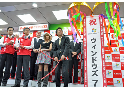 くす玉を割った瞬間 代表者らの一言が終わると、いよいよ午前9時の開店に向けてカウントダウンを開始。ビックカメラ関係者2人と南さん、樋口氏が紐を引くと、くす玉が勢いよく割れて「ウィンドウズ7 発売」の文字が現れ、店頭ピロティは祝賀ムードに包まれた。