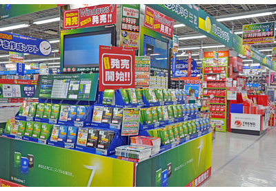 ビックカメラ有楽町店本館 4階のPCソフトのコーナー 開店後のビックカメラ有楽町店本館では、4階のPCソフトのコーナーにWindows 7のパッケージ製品が陳列されたほか、5階のPCフロアではメーカーごとにWindows 7搭載PCが配置された。このほか、店内フロアの中央を走る通路には、「Windows 7」の文字とテーマーカラーのグリーンを採用した長い帯がプリントされ、Windows 7の発売記念ムードを一層盛り上げた。