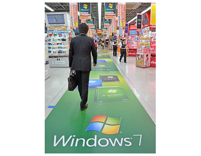 フロア1階の中央通路には「Windows 7」のグリーンの帯が店内奥まで伸びていた