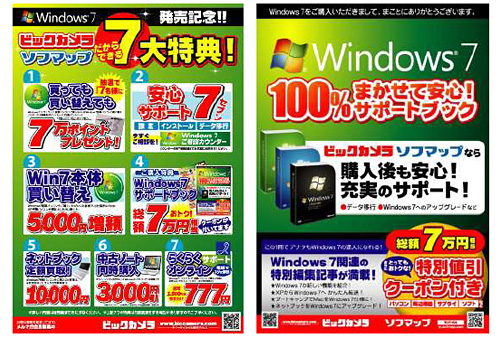 ビックカメラとソフマップは10月22日、同日発売したマイクロソフトの新OS「Windows 7」、または同OSを搭載したPCの購入者を対象に、「7大特典」としてさまざまなサービスの提供を開始した。なお、終了予定日は時に定めていない。