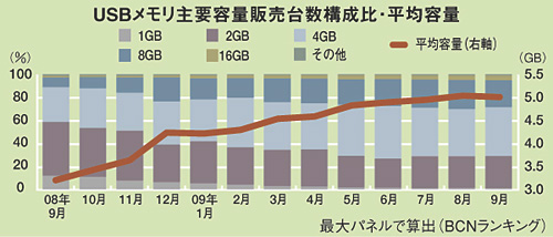 USBメモリの容量別の売れ筋は、1年前に比べ4GBの割合が30%から40%台へと大容量化した。台数が減る一方、平均単価は09年2月を底に上昇へ転じている。