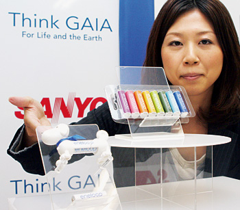 三洋電機はニッケル水素充電池「エネループ」で女性ユーザーを開拓する。使用回数を高めた充電池と犬の形のバッテリチェッカーが付いたセットやカラーモデルを11月から順次投入。主婦や若い女性の獲得を図る。