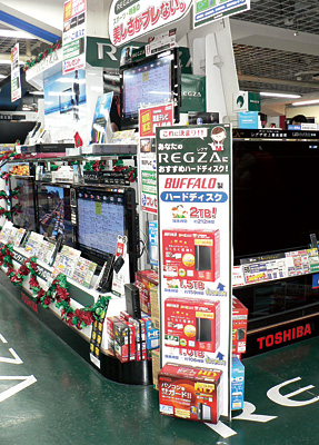 一方、HDD内蔵テレビは、「どちらかというと付加価値」という感覚で捉えられることが多い。「例えば東芝の製品を選ぶお客さんは、AV好きな人が多く、録画ができるかどうかで選んでいるわけではない」ようだ。ただし、東芝は、PC用の外付けHDDを接続できる製品が多いことから、バッファローやアイ・オー・データ機器の外付けHDDを購入していくお客も多いという。