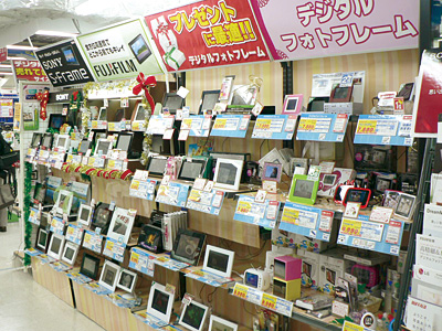 ビックカメラ新宿西口店2Fのデジタルフォトフレーム売り場では、「8割がプレゼントでの購入」(カメラコーナーの谷井千尋氏)という状況だ。用途は「娘から母親、結婚のお祝いや引き出物、贈り物のお返しにするケースが多い」(同)。画面サイズが7インチ程度、価格は1万5000円前後がギフト用では売れ筋だ。