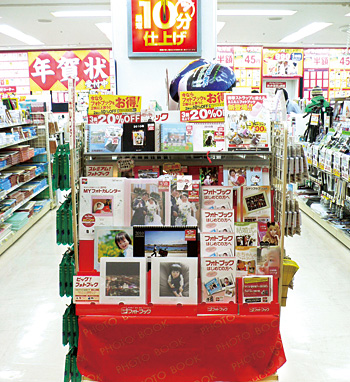 フォトブックコーナーは、メイン通路はもちろんのこと、店内の数か所に設置。「以前は一つの場所に固めて置いていた」が、今はあらゆる場所で目につくようにしている。多賀店長は、「デジカメのショット数は確実に増えているが、その一方で紙焼き写真は減っている」ことから、「プリントの付加価値を上げて、伝えていかなければならない。その一つがフォトブック」として、販売強化に力を注いでいる。