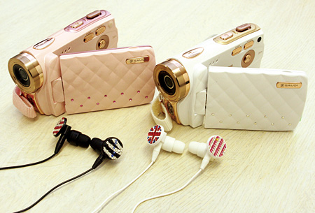 グリーンハウスが新たに投入する女性向けビデオカメラ(上)とイヤホン