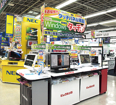同店では、来店者がWindows 7のマルチタッチ機能に非常に興味を示していることから、デスクトップPC売り場にタッチパネル搭載機種だけを集めたコーナーを設置。店員が実際に製品を操作しながら、タッチ操作の楽しさを伝えている。