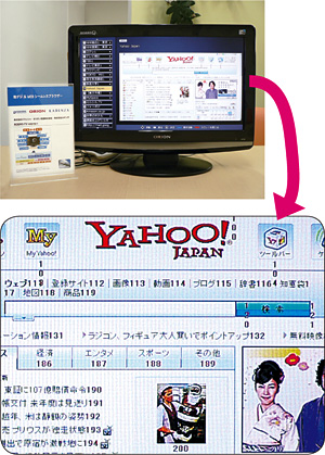 来年1月中にドウシシャを通じて発売するオリオン電機製19V型インターネット機能付き液晶テレビ「ロブロTV」。CPUには「Atom」を採用した(上)。リンク部分に表示された番号を押すと、リンク先に飛べる仕組み。普段パソコンを利用しない人でも、簡単にインターネットを利用できる(下)