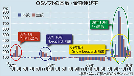 この「OS」について3年間のスパンで、発売直後の伸び率をみると――。07年1月の「Windows Vista」は発売直後に前年同期を上回った期間が3か月。これは、07年10月の新OS「Leopard」も同じく3か月だった。これに対し、「Snow Leopard」と「Windows 7」の売れ行きは、長期にわたって堅調だ。