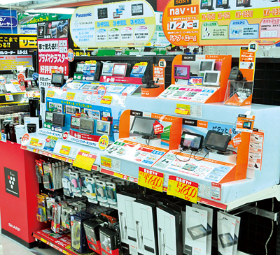 価格を抑えて女性に訴求 三洋、ソニー、パナソニック、パイオニアなど、大手メーカーが強いカーナビ市場で、今年に入って存在感を発揮しだしたのが、中小メーカーのトライウインだ。海外生産や少人数の従業員などでコストを抑え、低価格(2万円前後)の製品を投入している。1月の販売台数シェアは11.3%と、パナソニック(11.8%)とほぼ同レベル。主にテレビショッピングの販売チャネルを通じて、50~60代の女性ユーザーをターゲットに据え、「価格が安いので、2台目の車に最適」(商品企画担当の石井秀樹係長)と訴求する。今年、四つの新製品の投入でラインアップを拡大。新製品では、価格を抑えながらより技術を前面に押し出し、20~40代の男性ユーザーを狙う方針だ。