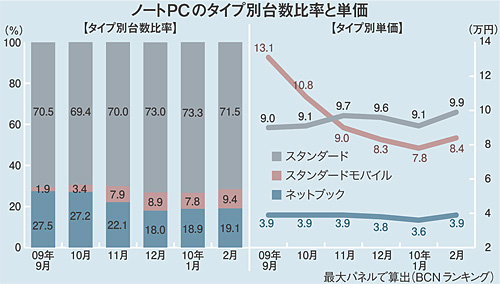 また、ノートパソコンのなかでは、最盛期に台数比率で3割を超えたネットブックの需要の落ち込みが顕著。2月は19.1%にとどまっている。年末商戦以降、ネットブック比率は2割を割り込み、一時のブームは沈静化傾向にある。ネットブックは、軽量・省電力でモバイル性に優れ、一世を風靡したが、使い込むにつれAtom系CPUの非力さゆえに、ユーザー離れが進んだようだ。これを見越したパソコンメーカー側も、年末商戦を機にネットブックよりも若干高性能な中間機を前面に打ち出し、ユーザーがそちらに流れた格好だ。