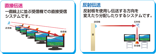 1台の送信機からライン上に並ぶ複数の受信機にミリ波を届ける「直接伝送」が9台、反射板でミリ波の電波を分配し、複数のテレビコーナーの受信機にミリ波を届ける「反射伝送」24台、計33台のテレビを対象に行う。