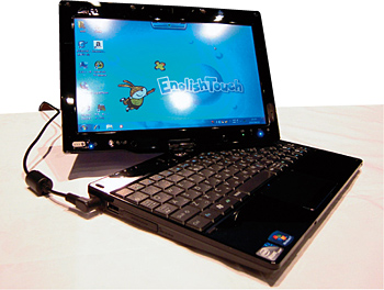 マイクロソフトの記者会見会場では「Eee PC T91MT」に子ども向けソフトを入れて展示した