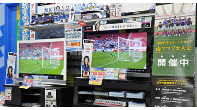 サッカーの2010 FIFAワールドカップ(W杯)南アフリカ大会。6月19日、日本の1次リーグ第2戦、オランダには0-1で惜しくも敗れたが、25日には第3戦のデンマーク戦が控えており、引き分け以上で決勝トーナメン進出が決まる。家電量販店では、日本が勝ち進むことが売上げ増につながると期待をかける。節目のときを目前にして、東京のソフマップの秋葉原本館では独自のサービスで競合店舗と差異化を図り、お客様を確保していく。