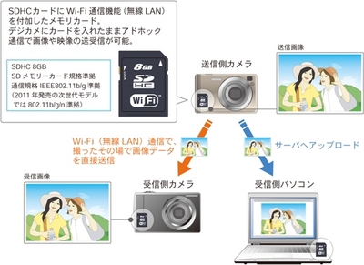 無線通信機能内蔵型SDカードは、SDHCカードにIEEE802.11b/802.11g規格のWi-Fi(無線LAN)に準拠した無線通信機能を付加したもの。SDHCに対応したカードスロットをもつデジタルカメラなどにこのカードを挿入すると、パソコンを介さず、対応機器同士で画像データを相互に送受信できる。対応フォーマットはJPEG/RAW、カードの容量は8GB。