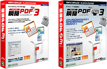 左から「瞬簡PDF3」「瞬簡PDF Plus3」 アプリケーションの「印刷」機能を使って、簡単にPDFファイルが作成できるソフト。最新のオフィスソフト「Microsoft Office 2010 32ビット版」で作成したデータのPDF作成に正式対応した。Microsoft Word/Excel/PowerPointのアドインボタンから、PDFを作成することも可能。PDF1.3-1.7、PDF/A-1bの出力や、画像解像度などの圧縮設定、フォントの埋め込みや、透かしの挿入、文書情報/開き方の設定などのセキュリティ設定もできる。