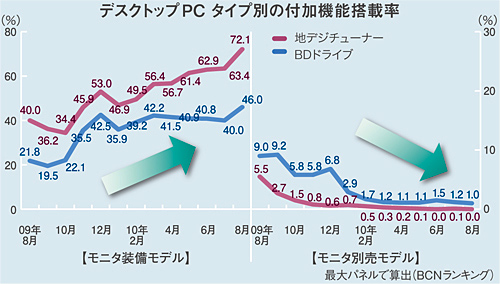 これに対して、モニタ別売モデルはこれらの付加機能の搭載率が月を追うごとに低下。地デジチューナーは09年8月の5.5%から10年8月は0.0%と皆無に、BDドライブは9.0%から1.0%と大きく比率を下げた。付加機能を徹底して省き、ベーシックな機能だけに特化しているのだ。