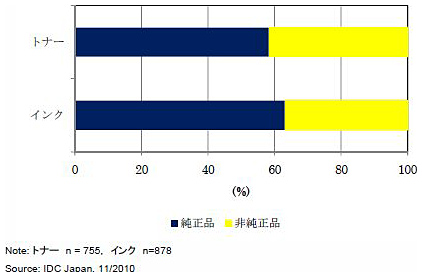 消耗品の使用については、純正品を使用する企業の割合は、トナーで58%、インクで63%だった。08年の景気後退が、リサイクル品やノンブランド品などの非純正品の使用を後押しした。