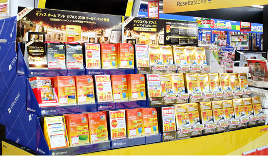 PCソフト売り場で「マイクロソフト オフィス ホーム アンド ビジネス 2010 ゴールド パック」を前面に押し出すビックカメラ有楽町店本館 10月29日から、Windows 7発売1周年記念キャンペーンとして、一部の販売店でWindows 7 Home Premiumのアップグレード優待パッケージを数量限定で販売。ビックカメラ有楽町店本館では、「好評ですでに売り切れてしまった」(担当スタッフ)という。