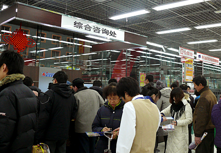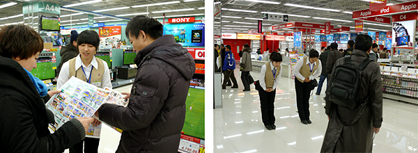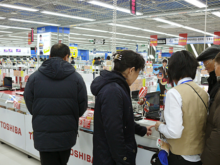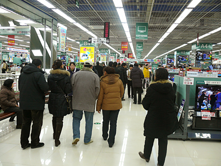 レジ付近は開店後10分で混雑 ヤマダ電機は、中国での差異化策として「徹底した接客」を掲げている。それを第1号店の瀋陽店でいかに実現するかが、今後の展開のカギを握っているといっていいだろう。実際に、店内の至る所で来店者が店員に質問を投げかける光景が見られたが、店員はその質問にしっかりと応対。またエレベータ前では、きちんと挨拶をしていた。