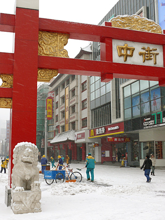 瀋陽店近くのショッピングモール「中街路」。昼頃には雪が積もった