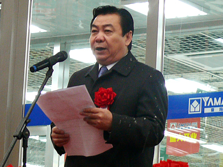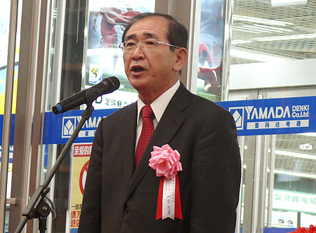 オープン直前に抱負を語る一宮忠男社長兼COO 続いて、遼寧省人民政府のヘイ(丙にこざと)志剛副省長が「オープンによって、瀋陽がさらに活性化することは喜ばしい。多くの日本企業が瀋陽に出店することで、経済発展につなげて欲しい」と訴えた。
