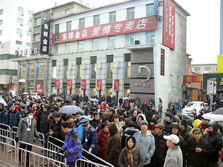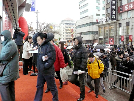 オープンを待つ人たちが、通行人の邪魔にならないように隣接の駐車場に行列をつくる オープニングセレモニーでは、一宮忠男社長兼COOが「瀋陽店が、遼寧省や瀋陽市当局にご指導、ご助言をいただき、開店に至ったことを深く感謝申し上げます」とお礼の言葉を述べ、「最も力を入れているCS(顧客満足度)の向上、つまり顧客第一主義をモットーに運営していく」と抱負を語った。