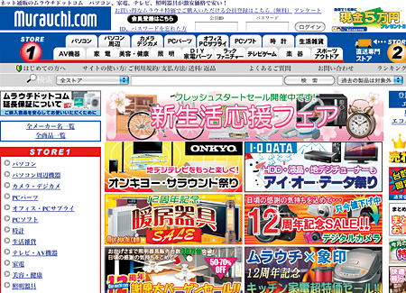 ムラウチドットコムは、PCやデジタル家電、白物家電から派生する関連製品の拡充によって、ユーザーの拡大を図っている。同社は、前身のムラウチオンラインストアの時代、ネット通販の黎明期から取り組んできた老舗。プリンタやスキャナ、PCパーツなどからビジネスを始めたが、現在はPC関連、AV関連、家電の三本柱で商品を展開する。ここ数年は、家電商品と関連性が高い家具や雑貨が全体の販売を押し上げている。