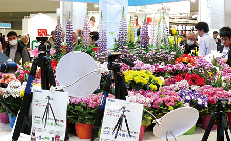 ベルボンはブースの中央をお花畑に見立てて三脚撮影の楽しさを訴えた