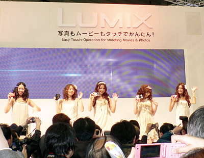 ミラーレス一眼で一歩リードするパナソニックは、ブースのステージで「LUMIX」新製品をファッションショーのような華やかな演出で紹介。オリンパスイメージングは、ブース入口付近にミラーレス一眼「OLYMPUS PEN」をかわいらしい小物とともに展示して、女性たちが撮影を体験していた。