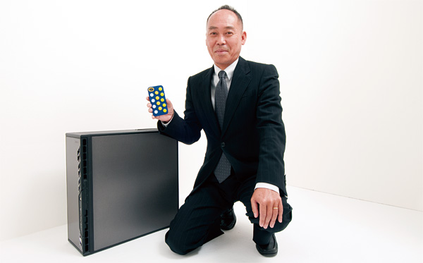 AntecのPCケース「P183-V3」とINCIPIOのiPhone4ケース「IPH-571」を手にする川島社長