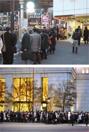 | 首都圏では地震発生直後から鉄道がストップ。帰宅時のターミナルはバスを待つ人々で溢れた(上:東京・銀座の数寄屋橋付近/下:東京駅) |