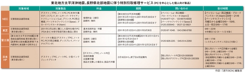 サポートについては、ピーシーデポコーポレーションが震災で被害を受けたPCの応急処置や修理を割引価格で対応。ユニットコムは、被災地の14店舗でPCの無償検査・診断サービスを実施している。なお、PCの修理サポートに関しては、メーカーも被災地を対象に特別引取修理サービスをメニュー化。すでに業界全体が、被災地の住民や企業の支援、被災地の復興支援に動いている。