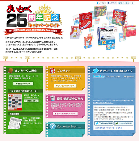 インターコム(高橋啓介社長)は、6月17日、パソコン通信ソフト「まいと~く」の25周年を記念し、「まいと~く25周年記念キャンペーン」を開始した。期間は9月30日まで。