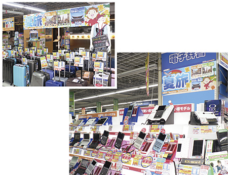 ビックカメラ有楽町店では、節電対策でサマータイム制を導入する企業が増えていることを背景に、本館6階のスーツケースコーナーでは、「夏旅」をテーマにしたPOPを作成して、アピールしている。今年6月頃からは「アフター4を有効に使おう」を打ち出し、金曜日夕方から土日を使った「プチ旅行」を提案。売り場担当の吉田佳世氏によると、「夏の旅行に向けてスーツケースが売れ始めるのは、例年は6月頃。今年の販売数は前年比で1割増えた」という。そのほか同店では、5階の電子辞書コーナーにも6階と同じ「夏旅」のPOPを設置。海外旅行に行く人をターゲットに訴求している。