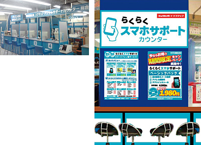 ピーシーデポコーポレーション(PCデポ)は、2010年春にスマートフォンの取り扱いをはじめたときから、サポートサービスカウンター「パソコンクリニック」にスマートフォンとPCの接続サービスを追加するなど、スマートフォン向けのサービスに力を入れてきた。11年には、携帯電話からスマートフォンへの「アドレス帳移行サービス」(5000円)や、「Twitter設定サービス」(5000円)などを開始。現在は無料・有料合わせて13種類のサポートサービスを提供している。PCのサービスで培ったノウハウを強みとする同社にとって、スマートフォンやタブレット端末、テレビ、ゲーム機など、インターネット対応デバイスの広がりは、ビジネス拡大の追い風になる。10月7日に発表した11年度上期の直営店の前年比売上高は、ハードウェアが98.7%だった一方で、サービス全体は125.4%と好調だ。サポートサービスに対するニーズの高まりが、如実に表れている。ビックカメラは、10月8日、東京・有楽町店に「らくらくスマホサポートカウンター」を開設した。従来の携帯電話と比べると、どうしても初期設定や操作などが複雑になってしまうスマートフォンが急速に普及したことで、使い方や設定に関する問い合わせが急増。「お客様の声に応えてサービスを始めた」(広報担当者)という。基本設定とメール設定、アドレス帳の移行、アプリのインストールをセットにした「ベーシックパック」(通常価格4000円)、スマートフォンの基本設定とメール設定、アドレス帳移行、Twitterやスカイプ、mixiなどのSNS設定、操作説明をセットにした「コミュニケーションパック」(通常価格7000円)などのパックや、単体のサービスメニューを用意し、スマートフォン初心者から上級者まで、幅広いユーザーが利用しているという。