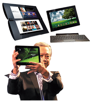 Android OSを中心にタブレット端末が続々登場。左上から、ソニー「Sony Tablet Pシリーズ」、ASUS「Eee Pad Transformer TF101」、「レグザ タブレット」を手にする大角正明・東芝デジタルプロダクツ&サービス社社長
