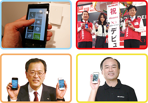 スマートフォンは新製品ラッシュ。KDDI(au)からは、富士通東芝モバイルコミュニケーションズ製「Windows Phone」が発売(左上)。NTTドコモからは「Xi(クロッシィ)」対応「GALAXY S II LTE」が発売(右上)。「iPhone 4S」は、ソフトバンクモバイルに加え、KDDI(au)からも発売(下段)