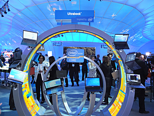 インテルが展示する「ウルトラブック」 世界最大のコンシューマーエレクトロニクスの祭典「2012 International CES(CES 2012)」が開幕した1月10日。インテルは早朝に報道関係者を集めて、いち早くブースを公開した。ブースでは、次世代CPUを搭載した「ウルトラブック」の多彩な使い方を提案している。「次世代」とは、前日の9日に開催した記者会見で、ムーリー・エデン副社長兼PCクライアント事業本部長がアピールしていたことだ。