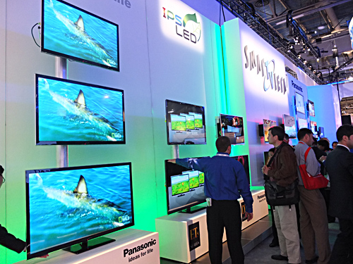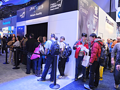 【ラスベガス発】「2012 International CES」開幕前日に、世界最小・最薄となる20型の「4K2K IPSα液晶パネル」を発表したパナソニック。ブースでは、そのパネルをひと目みようと多くの人が訪れ、映像の鮮やかさに感心していた。