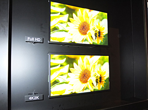 「4K2K IPSα液晶パネル」とフルHDを比較 液晶テレビでは、「きれい・簡単・つながる・エコ・デザイン」という五つのコンセプトを軸にした「Smart VIERA」のコーナーが賑わっている。新たに55型と47型の大画面モデルの発売を発表し、ラインアップが一層充実した。