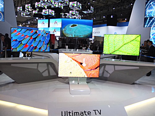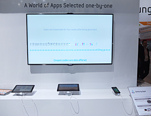 ブースに入ると、液晶テレビがずらりと並んでいる。特徴は、液晶テレビとスマートフォン/タブレット端末の連携を具体的に提案していること。アプリの追加や動画配信サービスに対応した「Smart TV」のブランディングを進め、テレビ局や映画会社と提携して動画配信サービス、アプリマーケット「Samsung Apps」でアプリを提供している。独自の動画配信サービスとアプリで、液晶テレビとスマートフォン/タブレット端末との連携を果たしているのだ。