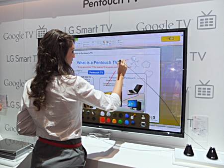 LGエレクトロニクスのブースでは、まず入口で3Dメガネを渡され、壁一面に貼り巡らしたテレビで3D映像を体験。ブースのなかに入っても、さまざまな場所に3Dテレビを設置しており、3Dメガネでさまざまな3D映像を楽しむことができる。