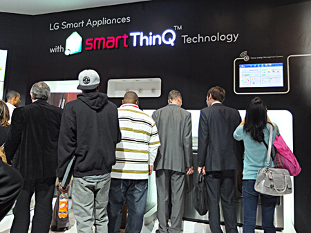 また、タッチパネル式の大型ディスプレイのデモンストレーションを実施したほか、電気料金の安い夜間に運転する洗濯機などのスマート家電システム「ThinQ」との連携を強調していた。