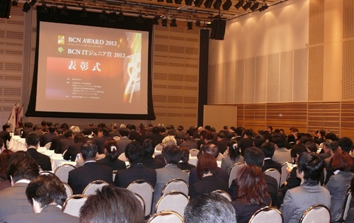 「BCN AWARD 2012」表彰式には約300人が集まった 「BCN AWARD」は、全国の主要なPC専門店や家電量販店、ネットショップなどから収集したPOSデータ「BCNランキング」にもとづき、年間で最も販売数量の多かったメーカーを部門ごとに表彰する制度。「BCN AWARD 2012」は、2011年1月1日~12月31日のデータをもとに、ハードウェア74部門、ソフトウェア33部門、計107部門/52社が栄冠に輝いた。